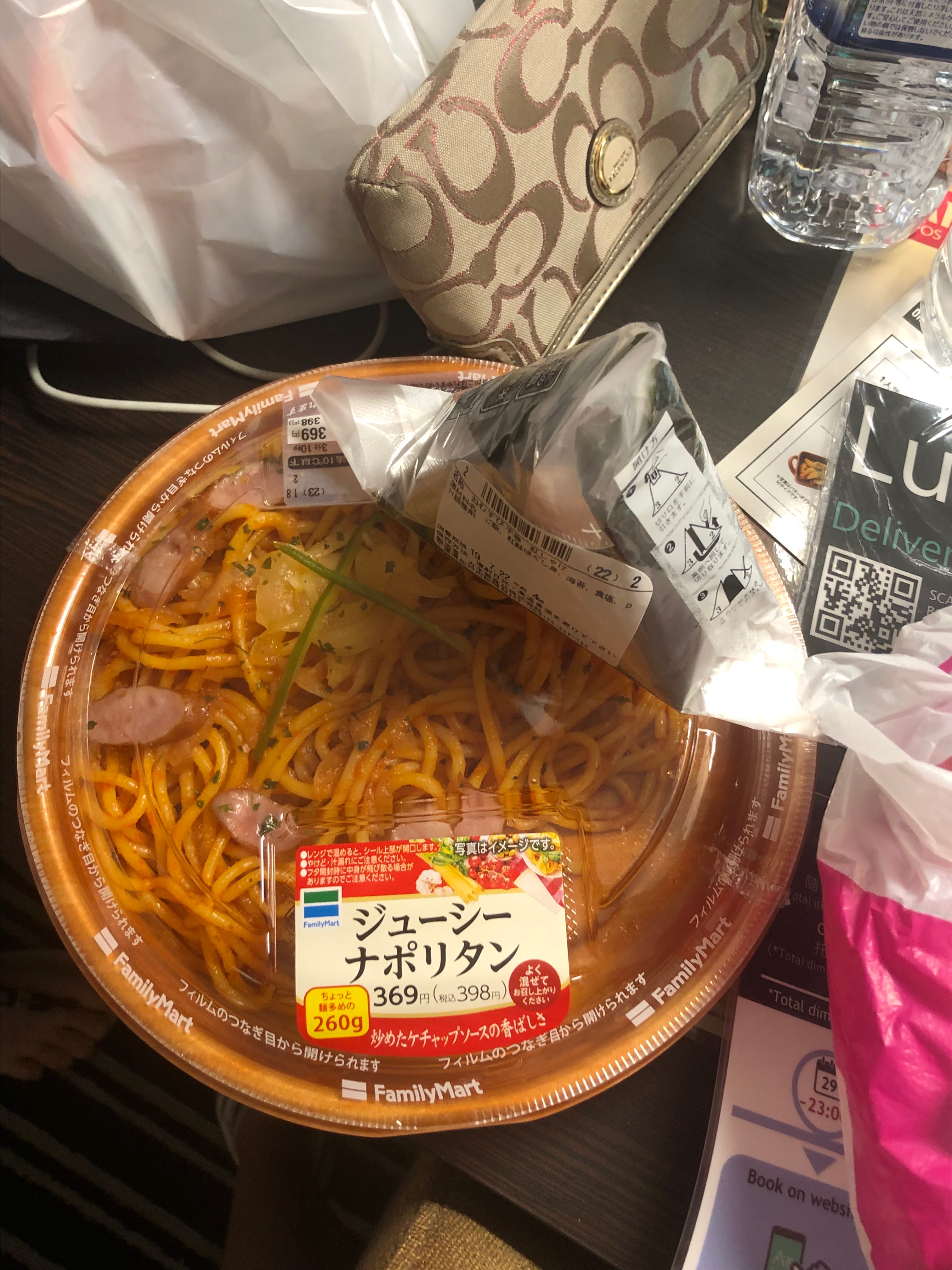 In the evening, after walking the whole street, I headed back to Kodemmacho (where our hotel is), and dropped off all my things in the hotel room. By this time, my feet and hands were sore and I was starving. On my itinerary, and on many other trips, it was recommended to go to the Kawaii Monster Restaurant, but I read many online reviews and just by passing it, I changed my mind. It was incredibly loud and the locals were telling me that it was a big waste of money. So I decided to fill my limpid, hollow log of a body with convenience store food instead, experiencing the life of a college student a year too early (affordable SHAD!) At the nearby FamilyMart, I bought a salmon onigiri and some pre-maid spaghetti and sausages. The noodles were microwaved for me and plastic utensils and a wet hand towel was provided as well, which is super nice.